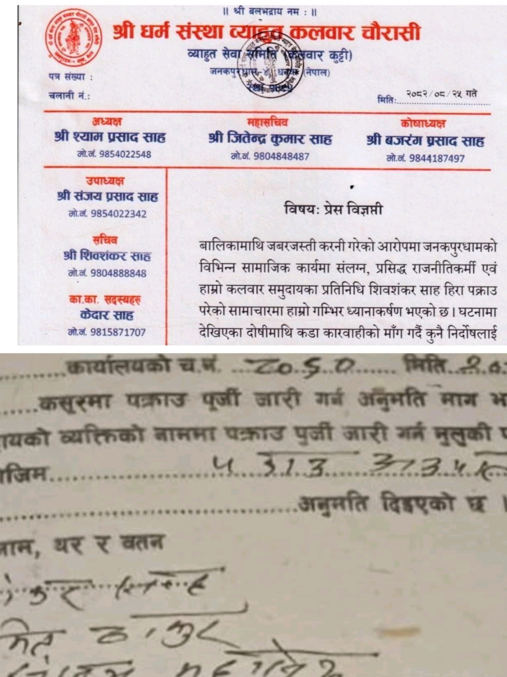 समुदायको विज्ञप्ति: ‘अनुसन्धान पूरा नहुँदै कसैलाई दोषी नठहराइयोस्’घटनापछि कलवार समुदायका प्रतिनिधिहरूले एक विज्ञप्ति जारी गर्दै आरोप अत्यन्त संवेदनशील भएकाले निष्पक्ष र व्यावसायिक अनुसन्धान आवश्यक भएको बताएका छन्। विज्ञप्तिमा भनिएको छ, “बलात्कार जघन्य अपराध हो। दोषीमाथि कडा कारबाही हुनुपर्छ। तर कुनै निर्दोष व्यक्तिलाई झुठा मुद्दा लगाएर फसाउने कार्य भयो भने समुदायको तर्फबाट कडा विरोध हुनेछ।”