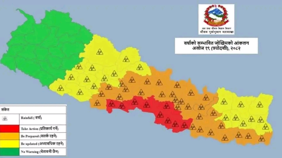 महाशाखाले असोज १७ देखि १९ गते (एकादशीदेखि त्रयोदशी) सम्मको मौसम विवरण सार्वजनिक गर्दै चेतावनी जारी गरेको हो। जारी बुलेटिनअनुसार त्रयोदशीका दिन मधेस प्रदेशका धेरै स्थान तथा कोशी, बागमती, गण्डकी र लुम्बिनी प्रदेशका केही स्थानमा वर्षाको जोखिम अत्यधिक रहनेछ। ती स्थानहरू पनि रेड एलर्टमा राखिएका छन्।