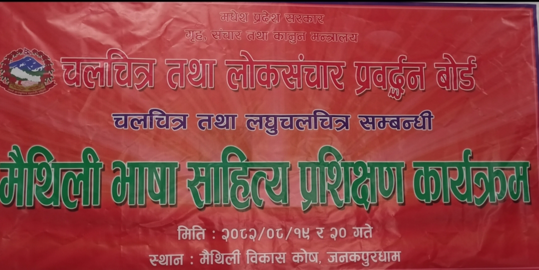 मंसिर २०, जनकपुरधाम। मधेश प्रदेश सरकारको गृह, सञ्चार तथा कानून मन्त्रालयअन्तर्गत चलचित्र तथा लोकसञ्चार प्रवर्द्धन बोर्डले मैथिली भाषामा चलचित्र तथा लघुचलचित्र निर्माणका लागि आवश्यक क्षमता अभिवृद्धि गर्ने उद्देश्यले २-दिने विशेष प्रशिक्षण कार्यक्रम सुरु गरेको छ। प्रशिक्षण आगामी मंसिर १९ र २० गते जनकपुरधामस्थित मैथिली विकास कोषमा सुरु भएको छ ।