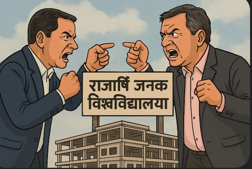 असार २४ जनकपुरधाम। शिवराम झा”गुड्डु”– जनकपुरधामको माटोमा ज्ञानको गन्ध छ। मिथिलाका प्रथम दार्शनिक राजर्षि जनकले यही भूमिमा ज्ञानको बीजारोपण गरेका थिए। तर दुःखको कुरा, आज त्यही माटोमा जब आधुनिक ज्ञान मन्दिरको निर्माण हुन थाल्यो—राजर्षि जनक विश्वविद्यालय—त्यहीँबाट सुरु भयो “जसको लफडा”। बिमलेन्द्र निधि र रघुवीर महासेठजस्ता दुई ठूला नेताहरू यस विश्वविद्यालयको बाबु को? भन्ने होडबाजीमा लागे। फलतः विश्वविद्यालय निर्माण अलपत्र पर्छ, शैक्षिक योजना राजनीति च्यापिन्छ, र जनता फेरि धोका खान बाध्य हुन्छन्।