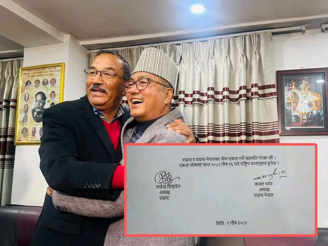 पुस ९, काठमाडौं — राष्ट्रिय प्रजातन्त्र पार्टी (राप्रपा) र राष्ट्रिय प्रजातन्त्र पार्टी नेपाल (राप्रपा नेपाल)बीच औपचारिक रूपमा एकता हुने भएको छ। दुवै दलबीच बुधबार एकतासम्बन्धी सहमति पत्रमा हस्ताक्षर भएपछि लामो समयदेखि चर्चा हुँदै आएको एकता प्रक्रिया टुंगोमा पुगेको हो।