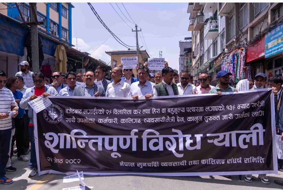 सोमबार काठमाडौंस्थित न्युरोडमा सुन व्यवसायीहरुले विरोध प्रदर्शन गरेका हुन् । उनीहरुले सुनमा लगाइएको दुई प्रतिशत विलासिता कर र हिरा पत्थरमा लगाइएको १३ प्रतिशत भ्याट खारेज गर्न माग गरेका हुन् । उनीहरुले सुनचाँदीको कारोबारका लागि व्यवसायीमैत्री एवं उपभोक्तामुखी स्पष्ट नीति र नियमावली एवं निर्देशिका निर्माण गर्न माग गरेका छन् ।प्रदर्शनकारीहरुले हाम्रा कुरा सुन्दे, चाहिए जति सुन दे,उपभोक्तामारा नियम चाहिँदैन, सरकार सुन दे, सुनचाँदीको कानून दे, उच्च कर हटाउ, व्यापार बचाउँ लगायतका प्लेकार्ड र नारासहित विरोध जनाएका हुन् ।
