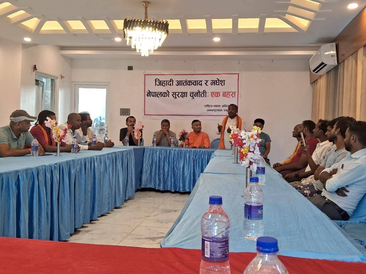 जनकपुरधाममा आजदेखि ‘जिहादी आतंकवाद र मधेश–नेपालको सुरक्षा चुनौती’ शीर्षकमा विशेष बहस कार्यक्रम सुरु भएको छ। राष्ट्रिय एकता अभियान को आयोजनामा भएको यस बहस कार्यक्रमको उद्देश्य नेपालमा मौलाउँदै गएको आतंकवादी प्रभाव, खुला सिमानाको दुरुपयोग, र त्यसले उत्पन्न गरिरहेको सुरक्षा जोखिमबारे गहिरो विमर्श गर्नु रहेको छ।